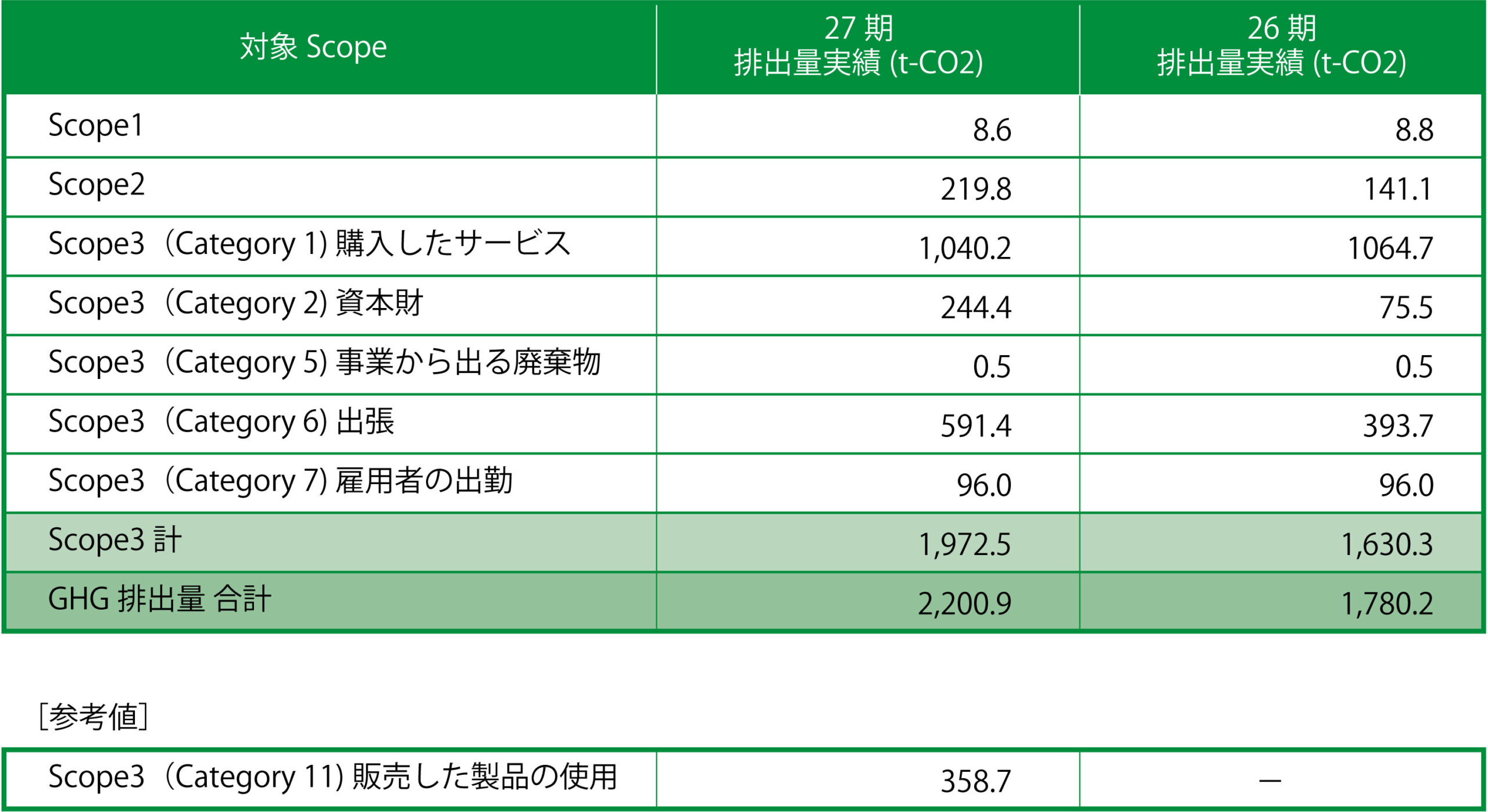 当社は、決算期毎にGHG排出量を算出し開示しています。情報開示元年である26期(2022年11月~2023年10月)および27期(2023年11月~2024年10月)のGHG排出量は以下の通りです。