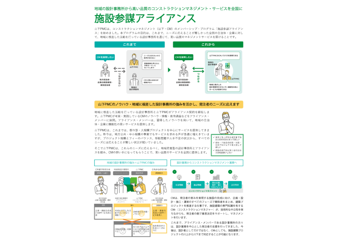 山下PMCは、CM(コンストラクションマネジメント)のメンバーシップ・プログラム「施設参謀アライアンス」を始めました。本プログラムの目的は、これまで、山下PMC単独ではニーズに応えることが難しかった全国の自治体・企業に対して、地域に根差した活動を行っている設計事務所を通じて、高い品質のCMサービスを届けることです。