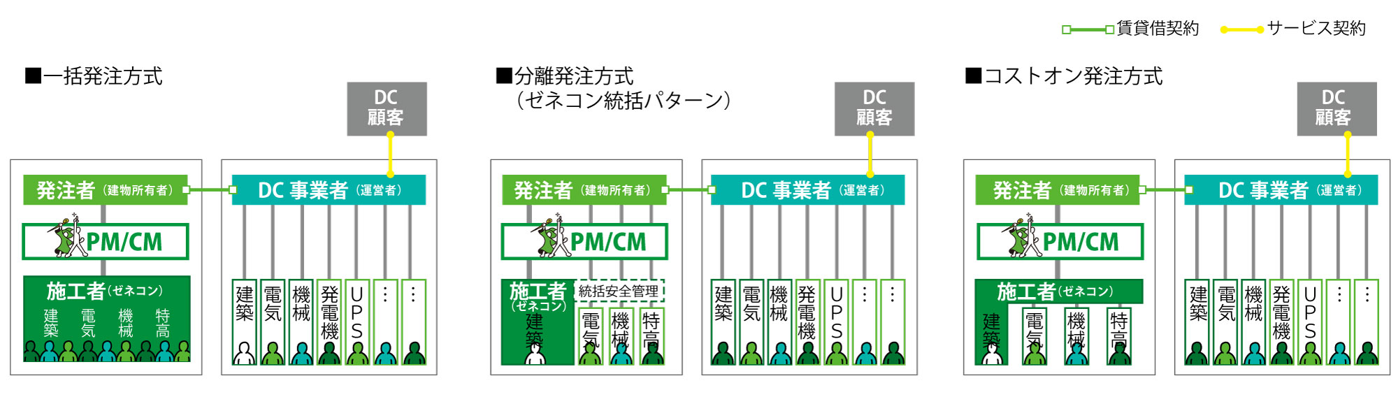 データセンターを開発する発注者は大きく、不動産会社、通信事業者、データセンター事業者の3つに分けられます。
