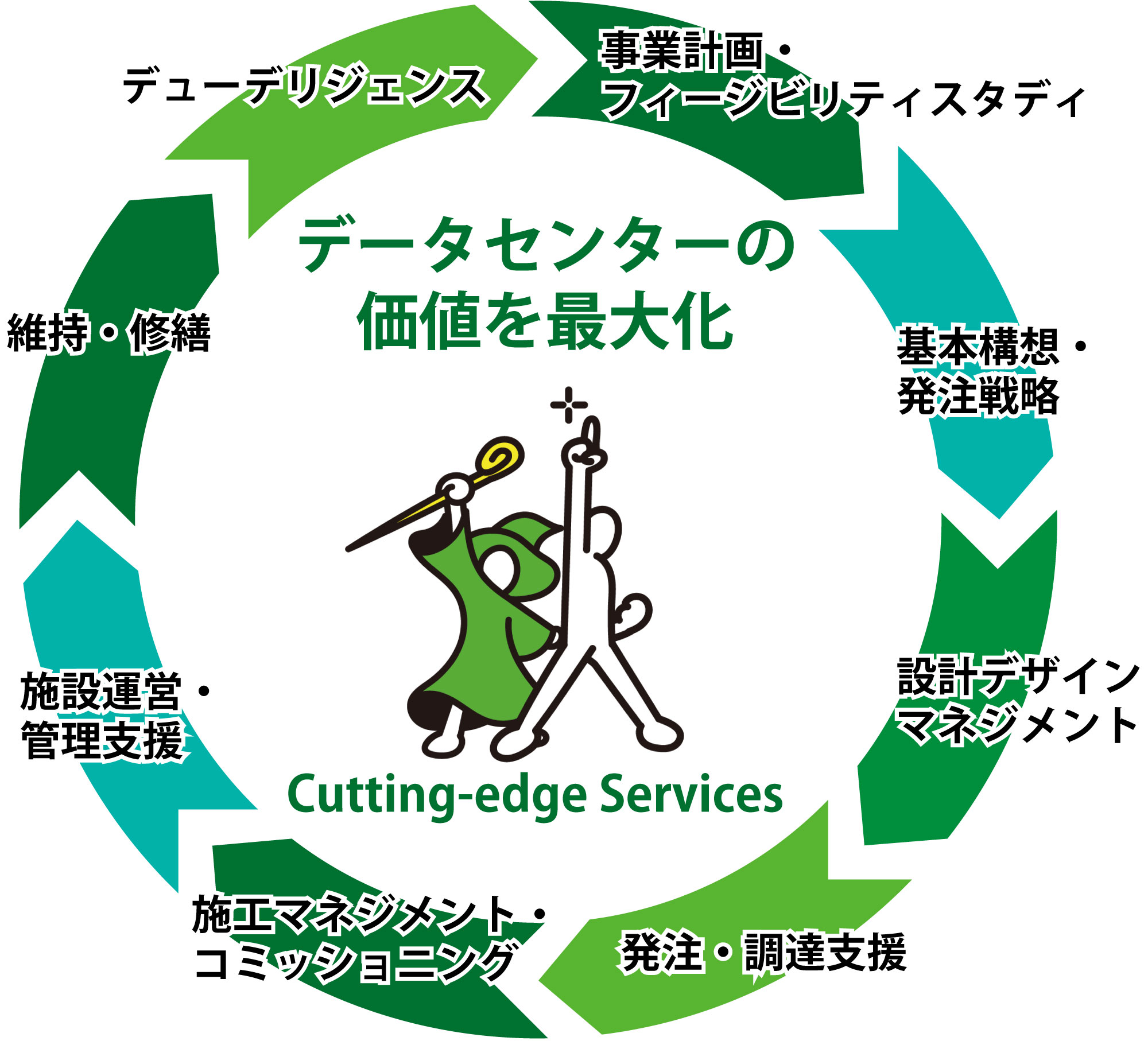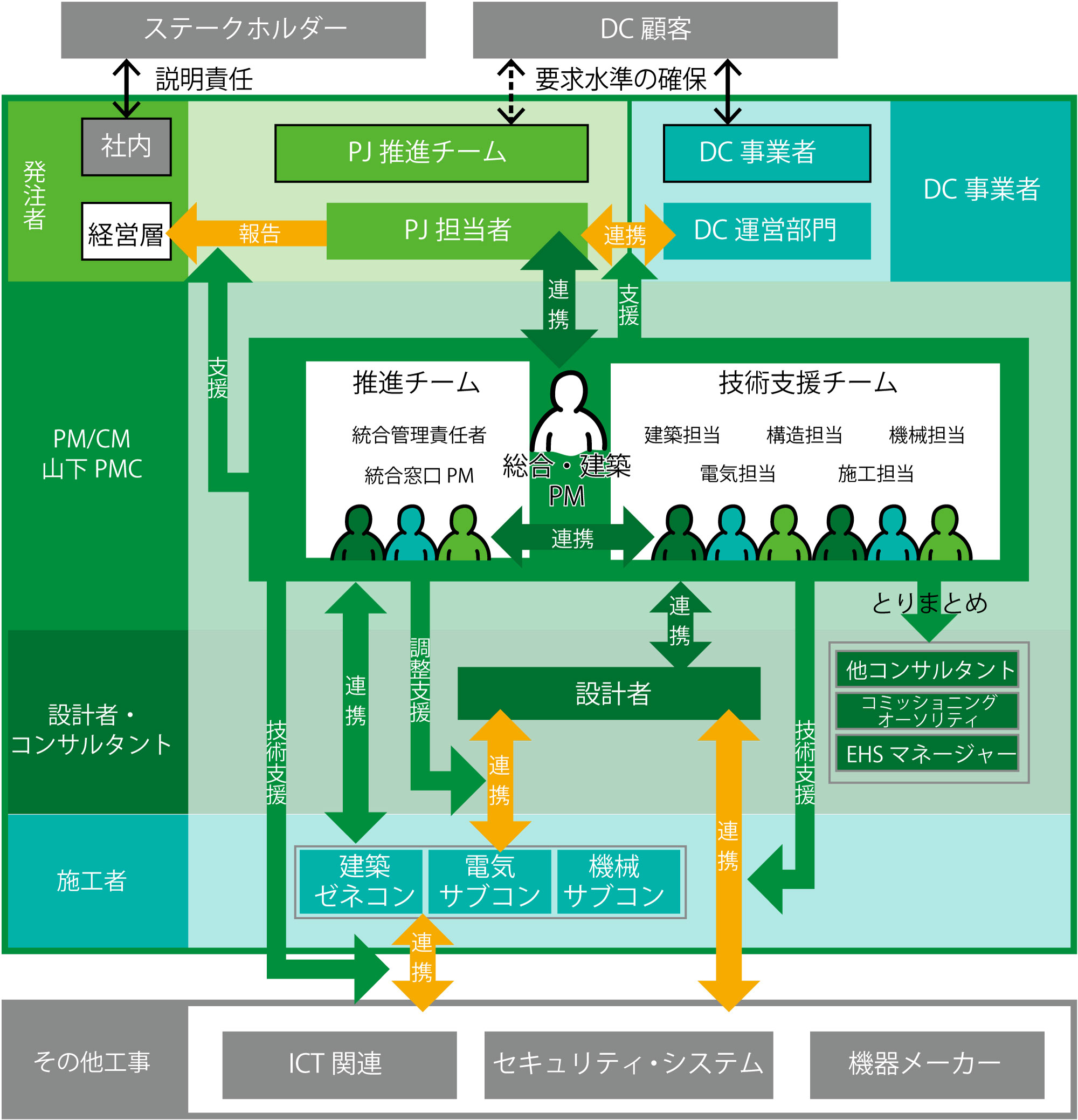 データセンターの建設に必要な知見と技術力をもつプロジェクトマネジャーでチームを構成し、発注者・データセンター事業者、設計・施工者ほか関係者と連携・支援