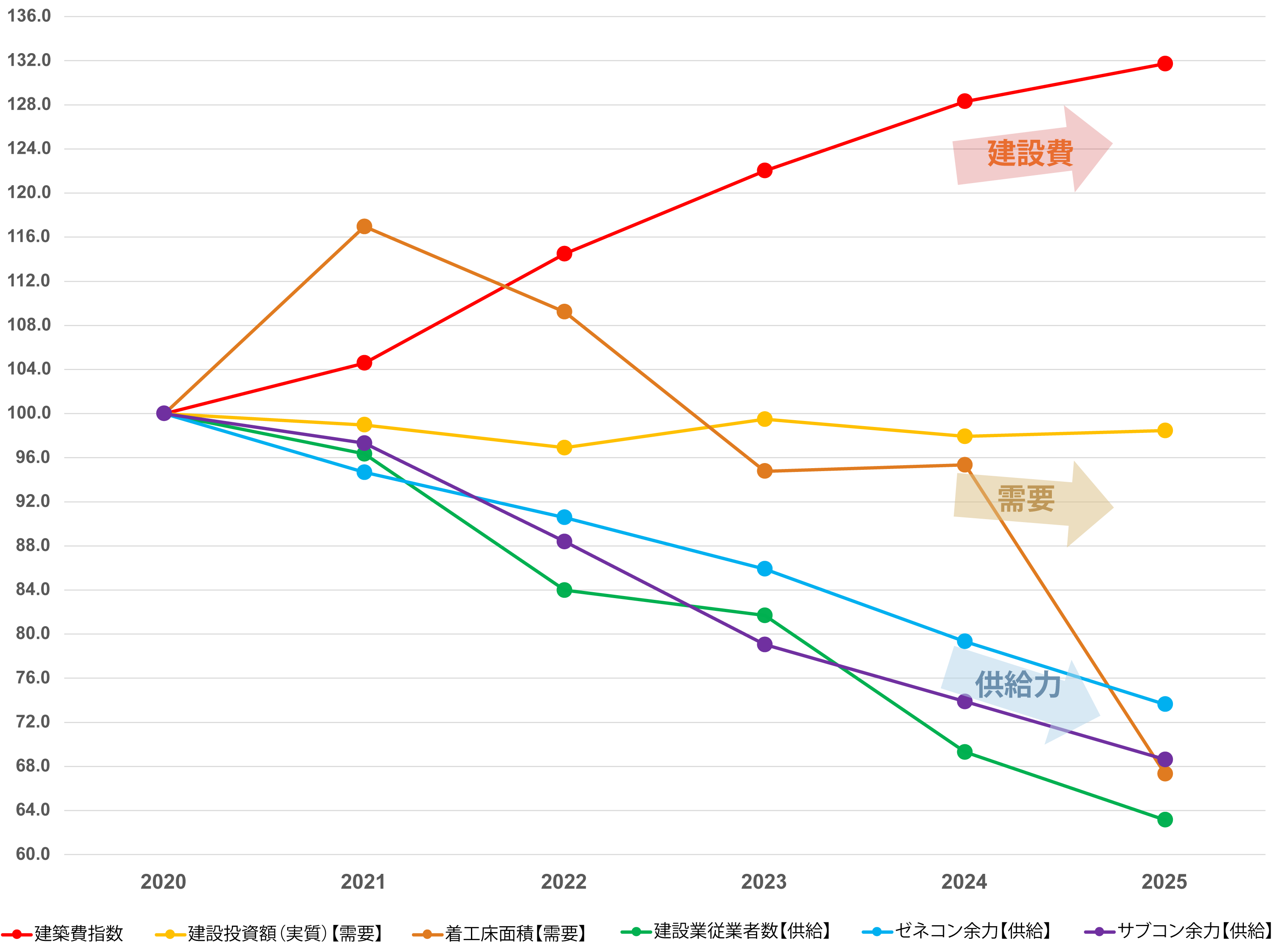 赤色が建築費指数、橙色・茶色の暖色系が“需要”、寒色系が“供給力”となります。