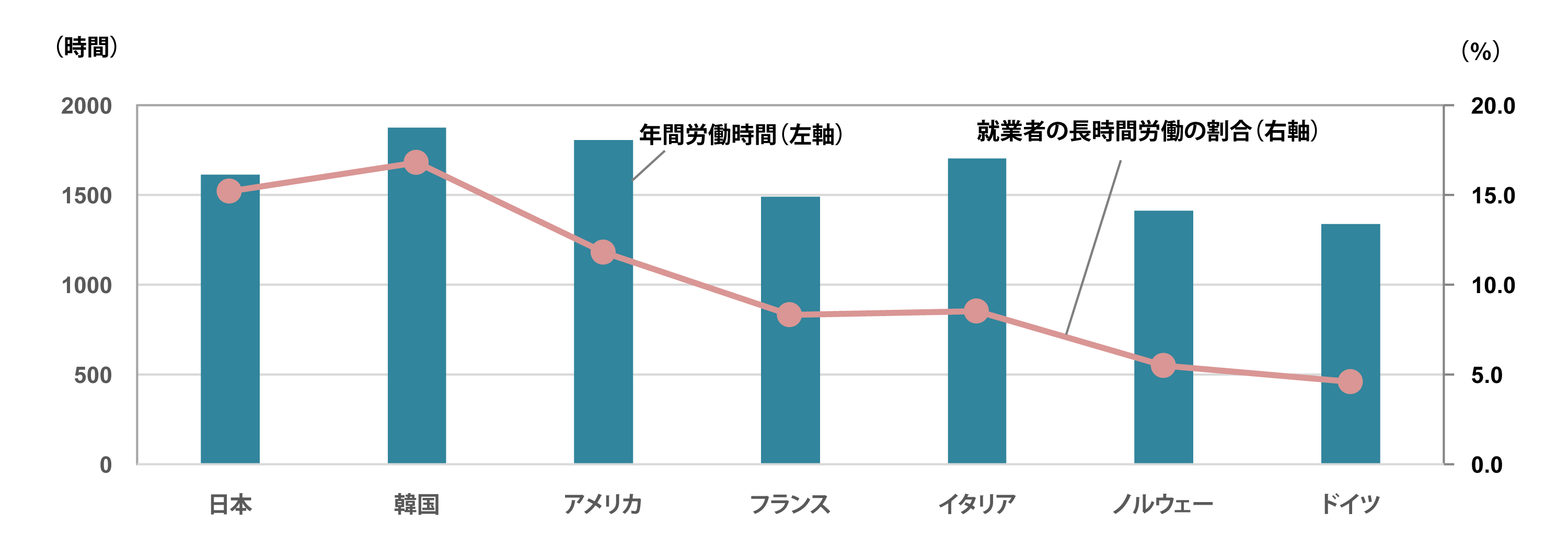 図表1「長時間労働の就業者の割合と年間労働時間」