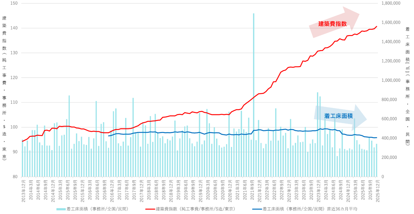 2025年11月の本レポートでも取り上げていますが、「需要」としての着工床面積は減少傾向にあります。