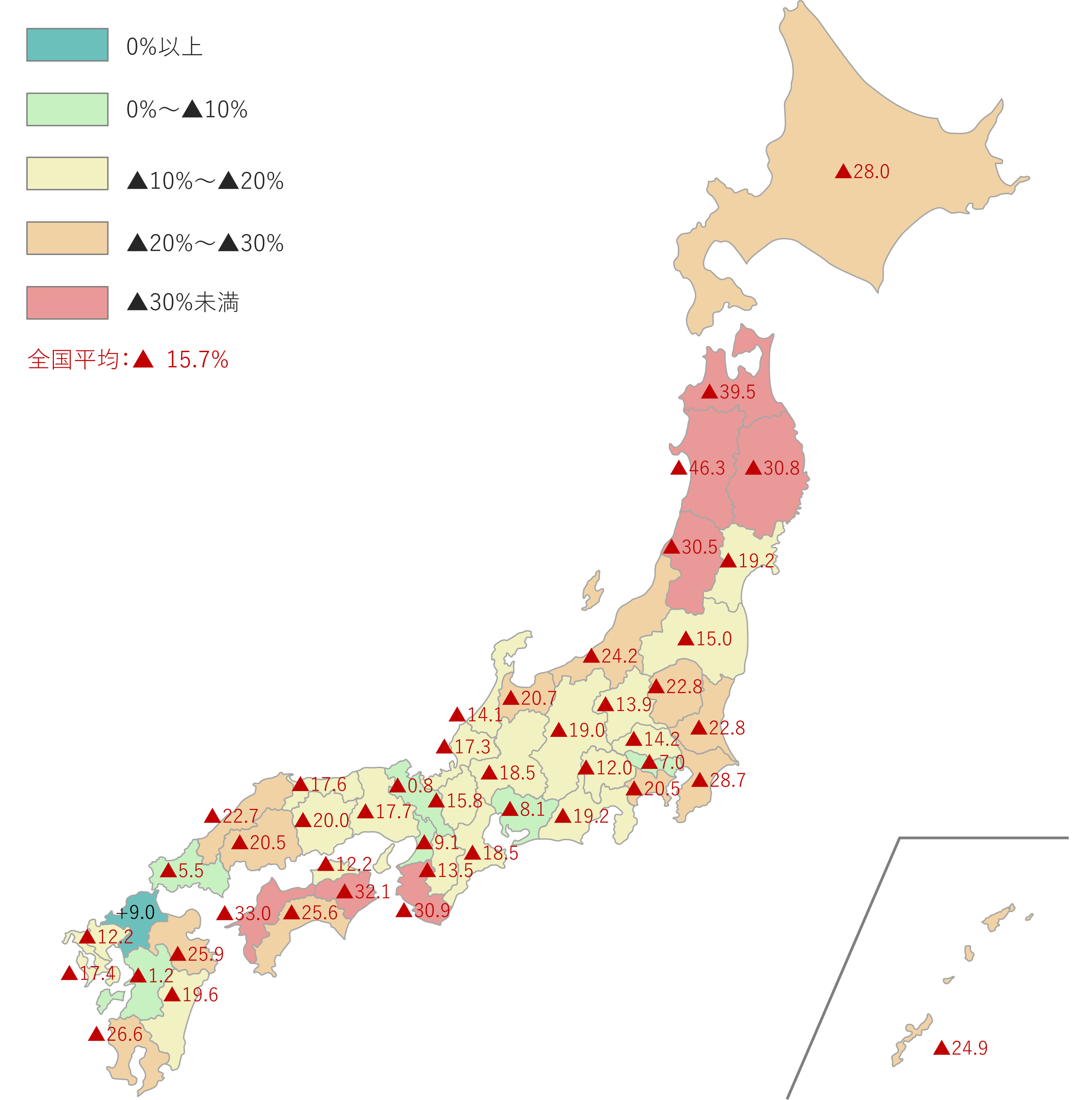 全国平均で▲15.7%の減少となっており、▲30%を超える減少率の都道府県も多く見られます。