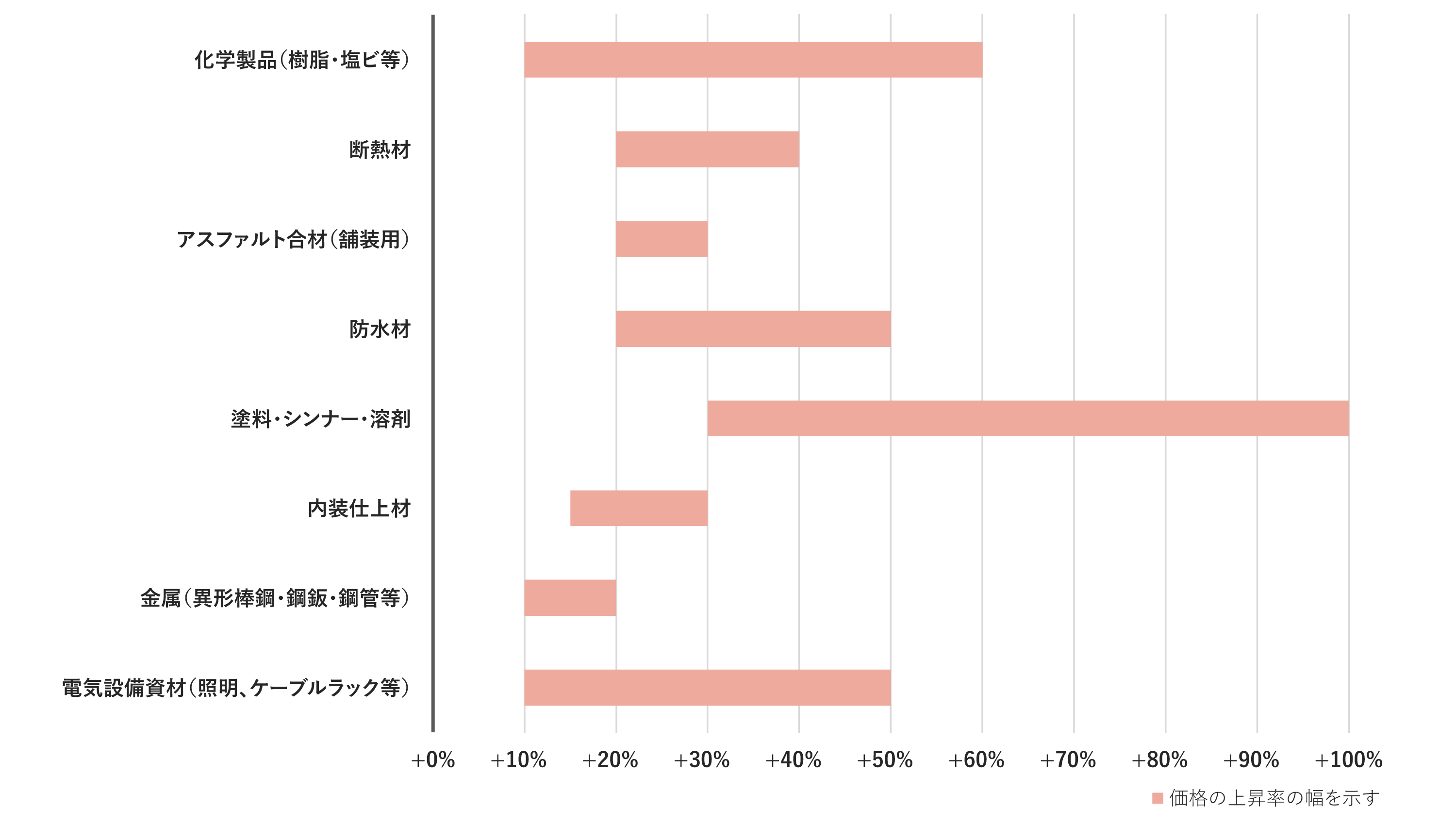 塗料や樹脂・塩ビ等の化学製品、防水材や断熱材、電気設備資材やアスファルト等、多種に渡り相当な上昇が見られます。